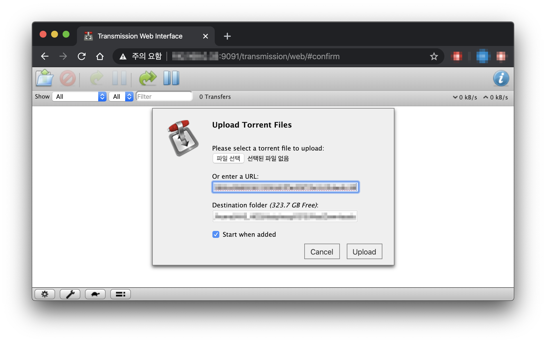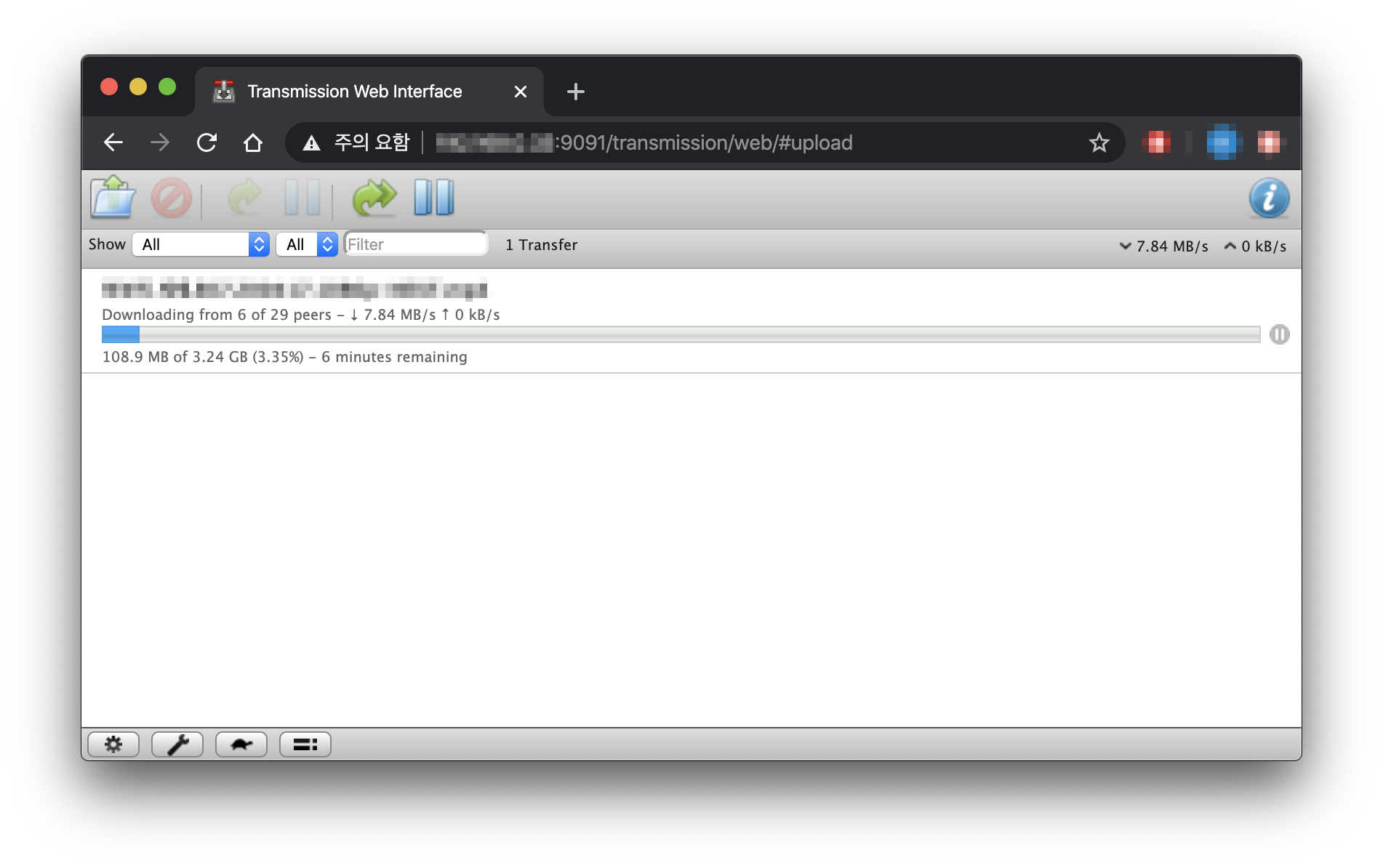<NAS주소>:<포트번호>로 접속하면 아래처럼 Transmission Web Interface를 사용할 수 있다.