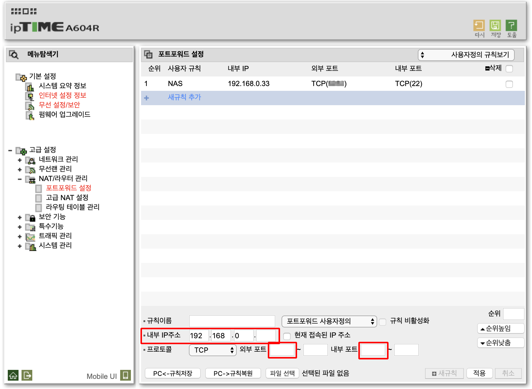 외부 포트 앞부분에 외부접속시 사용할 포트번호(예: 3333)를 적고, 내부 포트 앞부분에 22를 적는다.