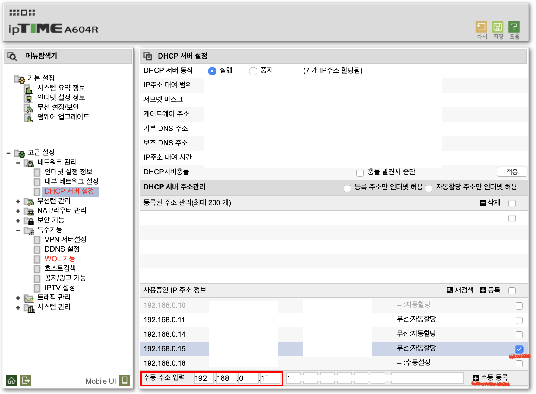 로그인을 하고 고급 설정 -> 네트워크 관리 -> DHCP 서버 설정