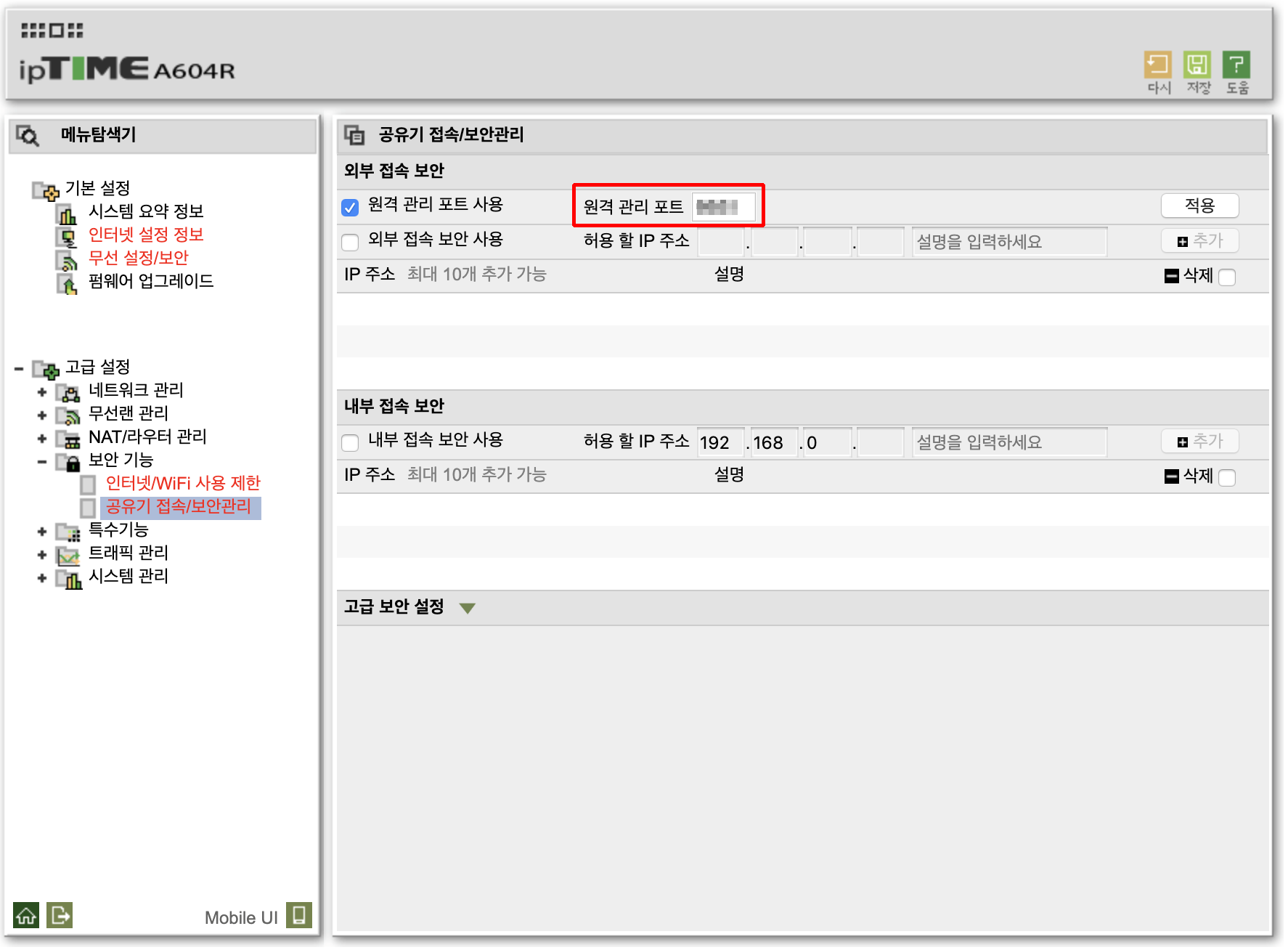 다시 공유기 설정으로 들어가 고급 설정 -> 보안 기능 -> 공유기 접속/보안관리
