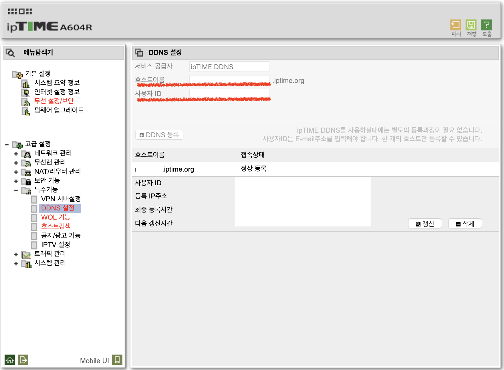 이제 192.168.0.1 말고도 설정한 호스트이름(****.iptime.org)로 공유기 설정에 접속할 수 있다.