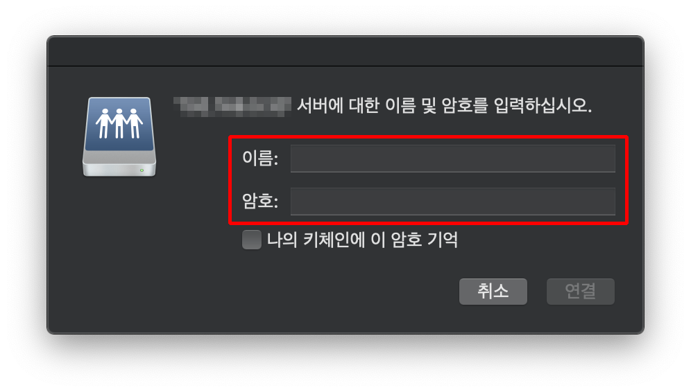 연결 주소에 NAS PC의 내부 IP주소를 입력한다. (afp://192.168.0.xx)
