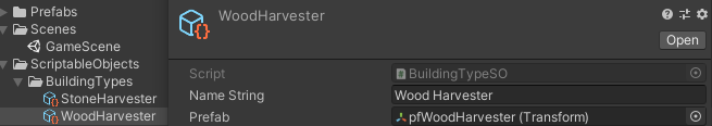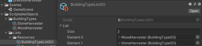 StoneHarvester와 WoodHarvester 두 종류의 건물을 ScriptableObject로 만들었다.