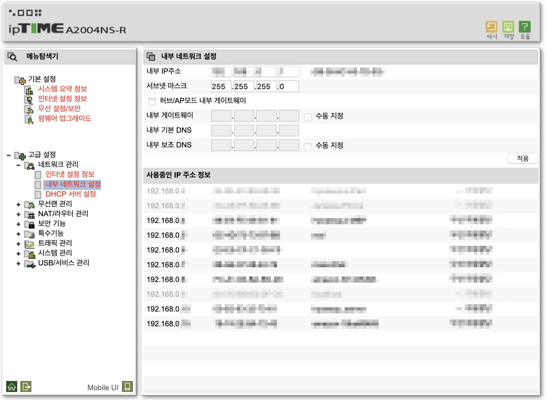 고급설정 - 네트워크 관리 - 내부 네트워크 설정에서도 연결된 PC의 IP 주소를 찾을 수 없다.