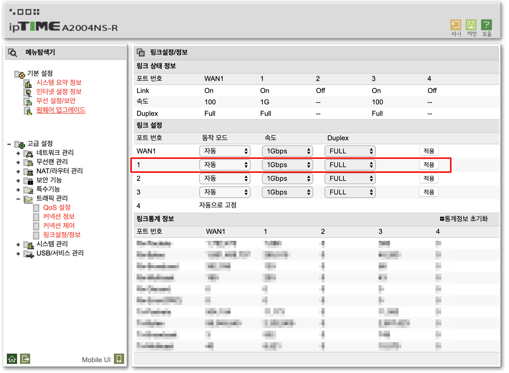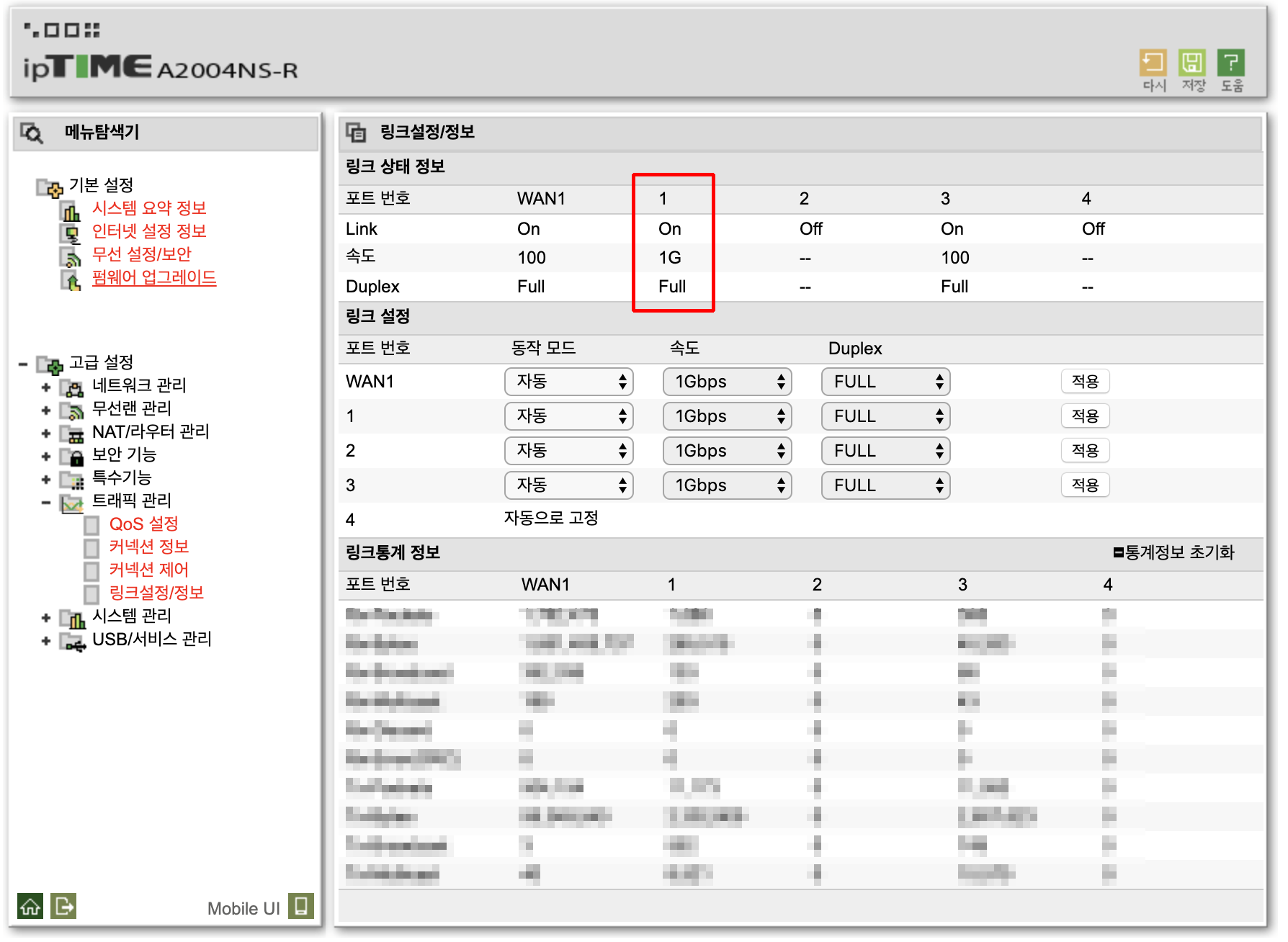 고급설정 - 트래픽 관리 - 링크설정/정보에서 확인할 수 있다.