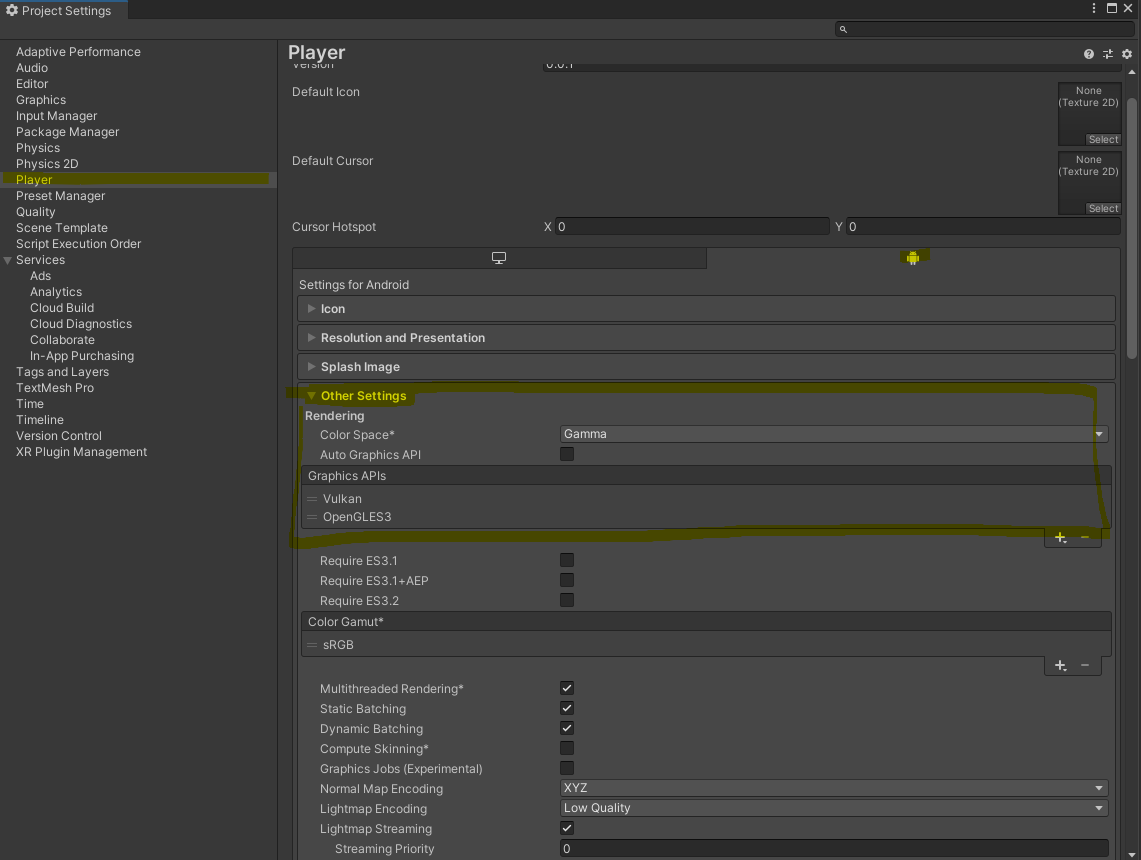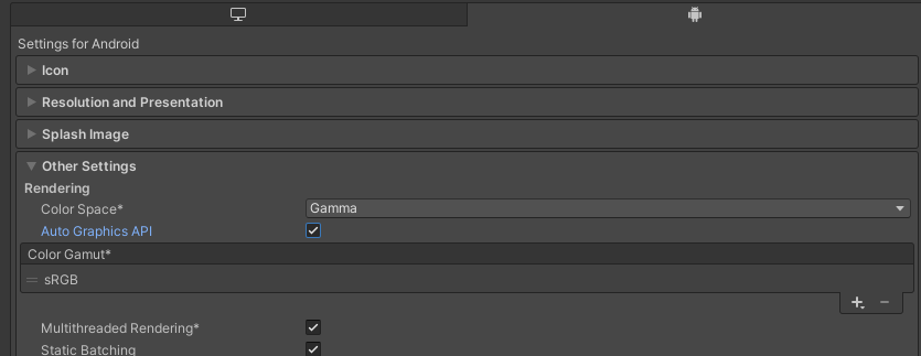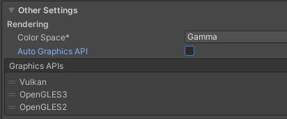 이때 Auto Graphics API가 체크되어 있다면 Graphics APIs 목록은 나타나지 않는다.